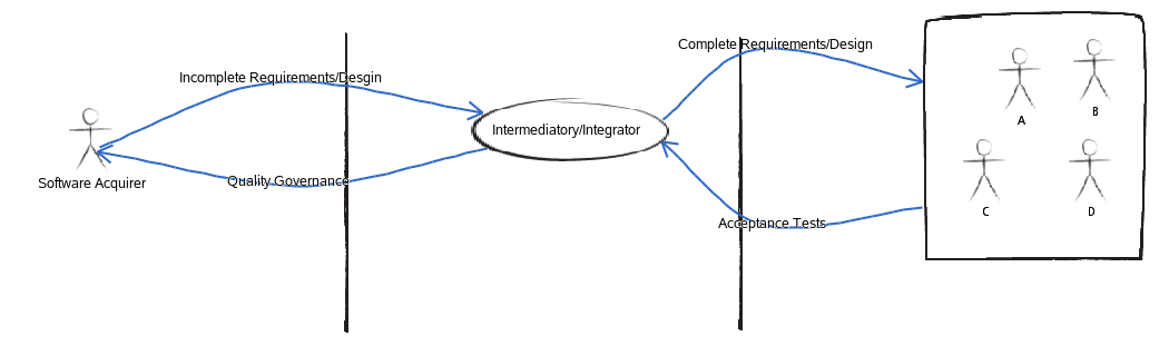 The essence of the discussion was captured by a visual description given by Yabuta-san of the interactions between acquirers and suppliers. Yabuka-san called out the need for an intermediary – an organization that translates the incomplete requirements coming from the acquirer, to complete requirements – in a form acceptable to the supplier(s). And in the reverse direction, conducts acceptance tests on the components created by the supplier(s) to make sure they conform to the Quality Governance requirements of the acquirer. This organization may be an internal organization or an external third party, neutral to the supplier(s). Their role is to be able to, as Yabuka-san put it – speak the language of both worlds. They would be responsible for ensuring proper governance across the entire supply chain. Their goal should be to take the relationships between the acquirer and the suppliers beyond contracts and SLAs – to good mutual understanding and trust, fostered by ongoing and continuous communication. I have captured this in the diagram below. (I will post my thoughts on how IBM and Rational’s PPM solution can add value in this space in a future blog post.)